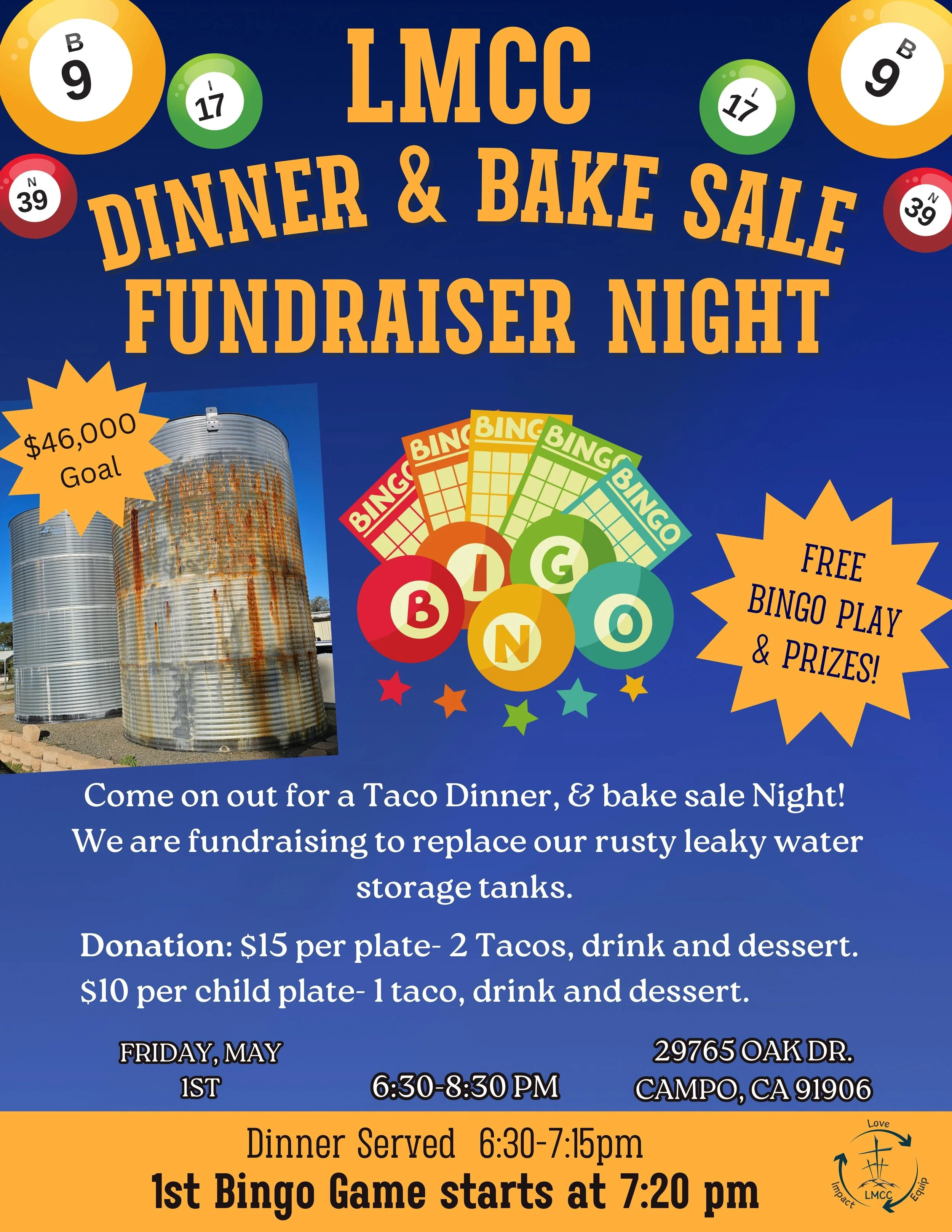 Join us for a fun night! We'll have a taco dinner, a bake sale fundraiser and Free Bingo play with prizes!