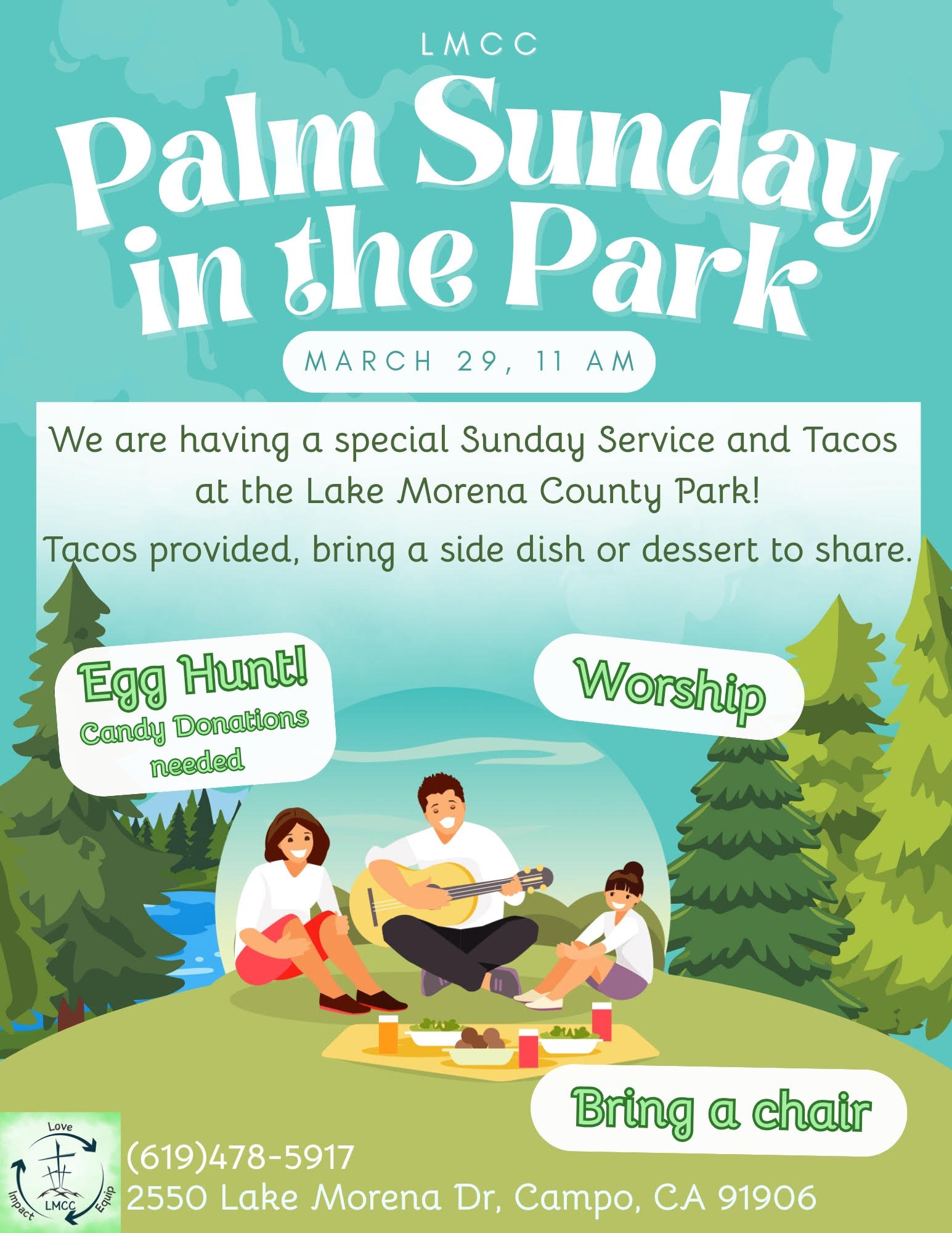 Join us for Palm Sunday Service at the Park! We will be at Lake Morena County Park at 11 am March 29th. Bring a chair and a side dish or dessert to share. Egg hunt to follow!